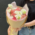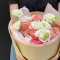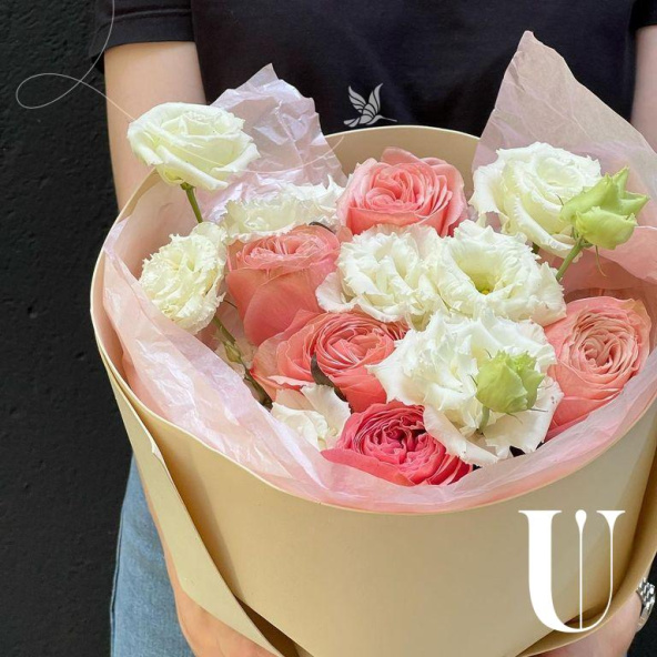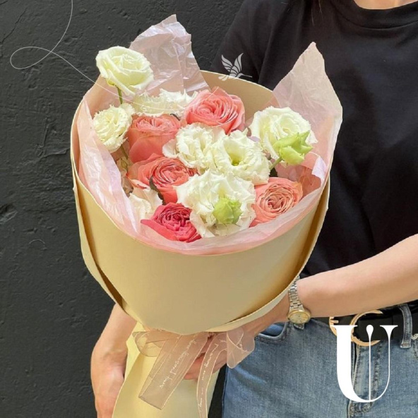 Букет из розовых роз, белых эустом и розовых антирриумов в дизайнерской упаковке