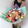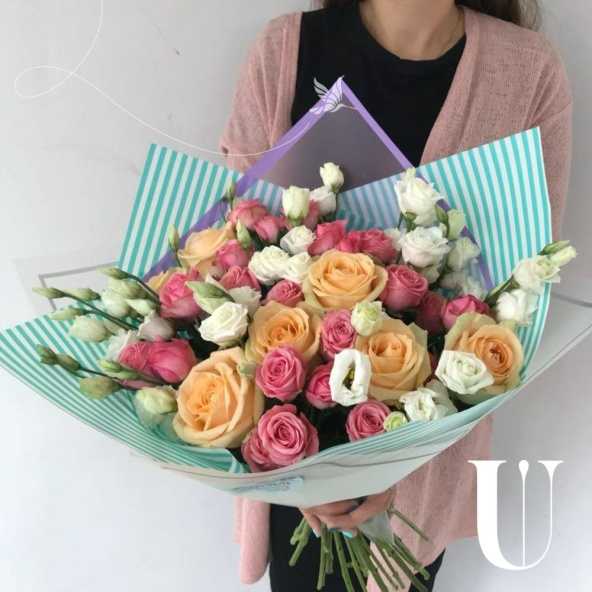 Роза Россия 7шт, роза кустовая розовая 6шт, эустома белая 8 шт, зелень, бумага, лента