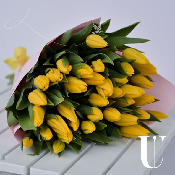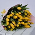 Букет из тюльпанов красного цвета 25 шт, обернутый бумагой, перевязан лентой атласной