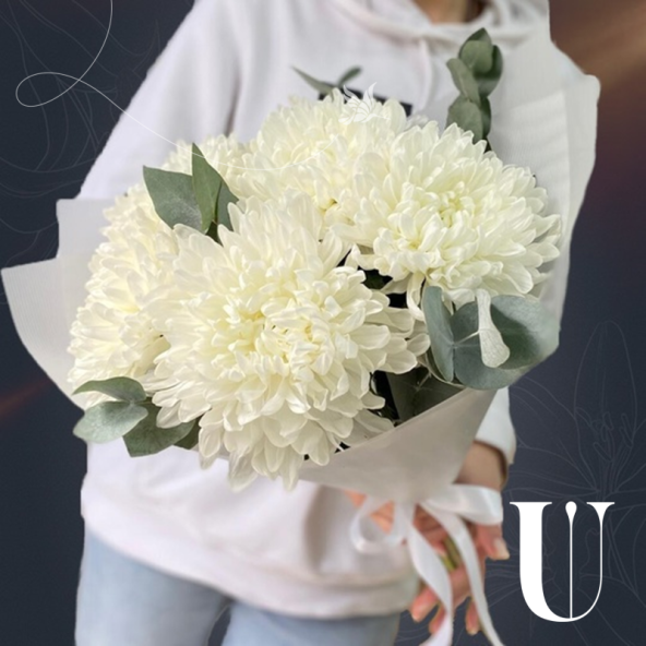 Монобукет "Эбба" из 5 белых хризантем с эвкалиптом в корейской матовой пленке с атласной лентой - это стильный и изысканный подарок, который подойдет для любого повода. В составе букета шаровидные одноголовые хризантемы, одни из самых стойких цветов, с крупными белыми бутонами и насыщенно-зелеными листьями. Ветви эвкалипта придают букету еще больше свежести и нежности.