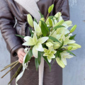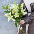 Монобукет из белых кустовых хризантем с эвкалиптом в упаковке