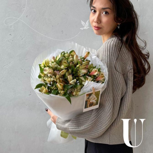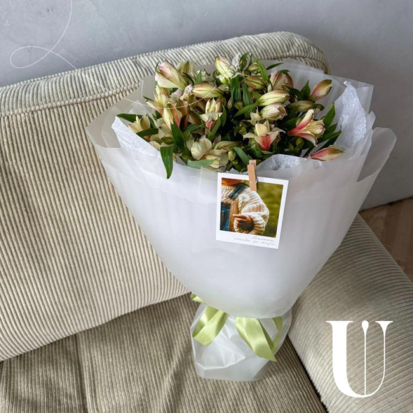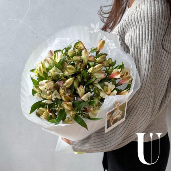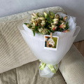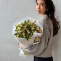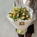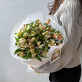 Ягодные кустовые розы с эвкалиптом в белой упаковке