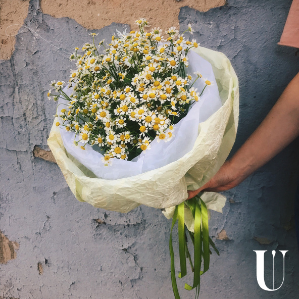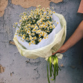 Монобукет из желтых кустовых пионовиднгых роз с эвкалиптом в упаковке