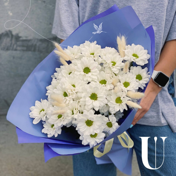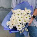 Монобукет из белых кустовых хризантем с эвкалиптом в упаковке